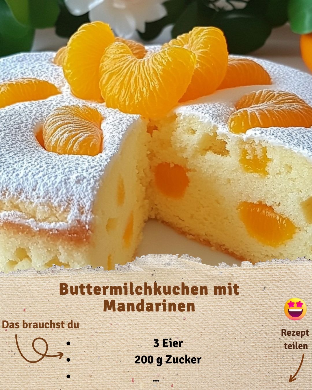 💡 Wenn der Sommer ins Dorf kam, zog der Duft von frisch gebackenem Buttermilchkuchen durch Omas Garten. Sie holte die Buttermilch frisch vom Bauernhof, öffnete eine Dose Mandarinen – und zauberte daraus ein fluffiges, fruchtiges Blech voller Kindheitserinnerungen. Noch warm, mit leicht geschmolzenem Zuckerguss, war er unser liebster Gartennachtisch – serviert unter Apfelbäumen, barfuß im Gras.