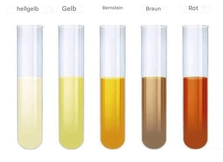 Die Farbe von normalem menschlichen Urin kann von durchscheinend gelb bis dunkel bernsteinfarben reichen.