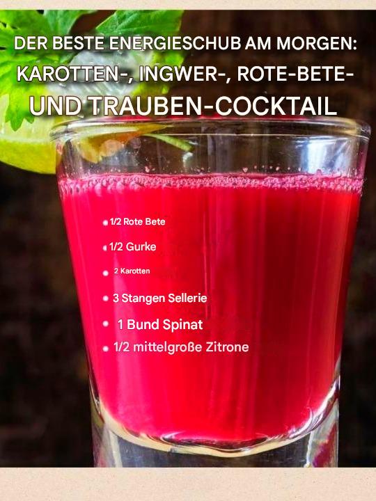 Dank dem Karotten-Ingwer-Rote-Bete-Trauben-Cocktail versorgst du deinen Körper mit viel Energie, unterstützt die Verdauung, stärkst deine Immunität und fühlst dich einfach vom ersten Schluck an besser!