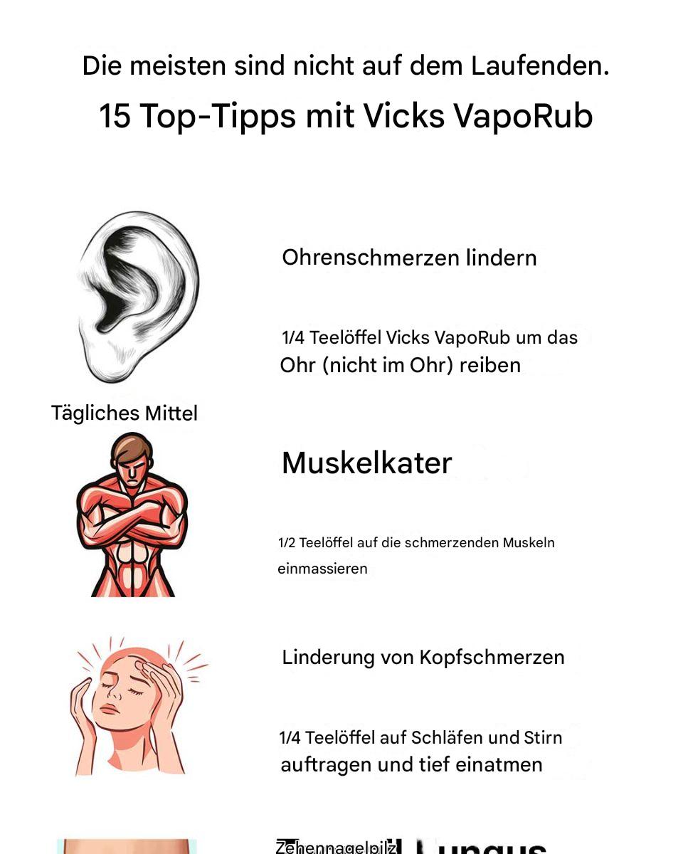 Vicks VapoRub ist ein beliebtes Haushaltsprodukt und bekannt für seine lindernde Wirkung bei Husten und Erkältungssymptomen. Viele wissen jedoch nicht, dass es über seinen eigentlichen Zweck hinaus vielseitig einsetzbar ist. Dieser Artikel stellt 15 innovative Tricks vor, die die überraschende Vielseitigkeit dieser Mentholsalbe demonstrieren. Von gesundheitlichen Vorteilen bis hin zu praktischen Anwendungen im Haushalt erweist sich Vicks VapoRub als multifunktionales Produkt, das Ihr Leben auf unerwartete Weise vereinfachen kann.