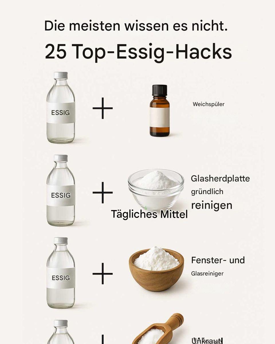 Essig, ein Grundnahrungsmittel in den meisten Küchen, wird oft wegen seiner Vielseitigkeit über das Kochen hinaus übersehen. Diese bescheidene Flüssigkeit, die hauptsächlich aus Essigsäure und Wasser besteht, wird seit Jahrhunderten in verschiedenen Anwendungen verwendet. Von der Reinigung bis zur Körperpflege geht das Potenzial von Essig weit über seine kulinarische Verwendung hinaus. In diesem Artikel werden 25 geniale Essig-Hacks vorgestellt, die Ihr Leben vereinfachen, Geld sparen und die Abhängigkeit von aggressiven Chemikalien verringern können.