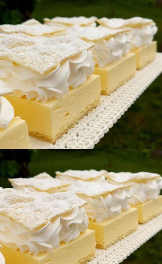 Auf den ersten Teigboden gießen und abkühlen lassen. Dann mit einem Spritzbeutel Sahne auftragen, Blätterteig darauf legen und mit Puderzucker bestreuen. Leicht, einfach, wunderbar❗️