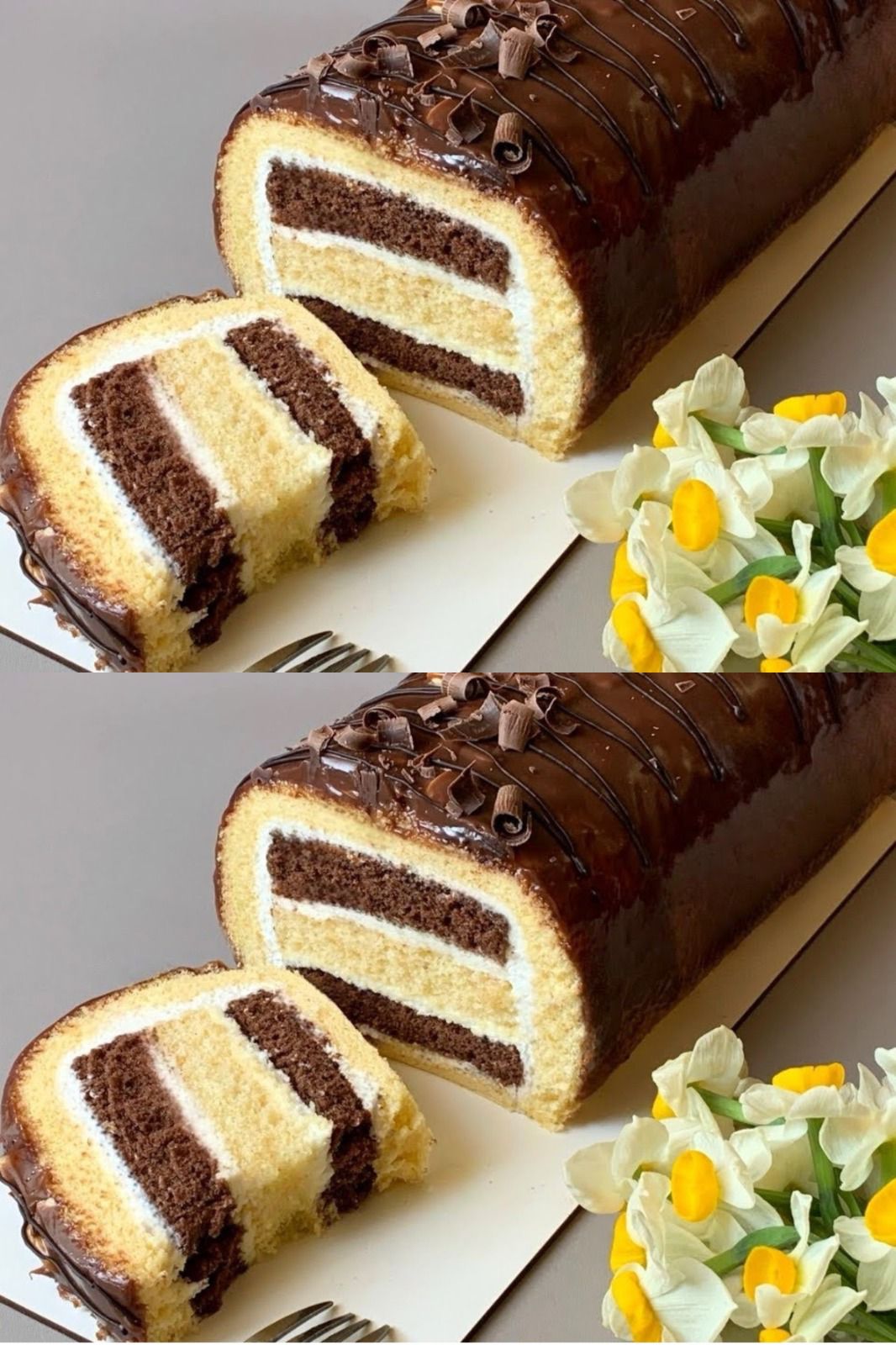 Zwei Kuchenschichten, eine cremige Füllung und ein glänzender Schokoladenüberzug – dieses atemberaubende Dessert ist weich, reichhaltig und überraschend einfach zuzubereiten!