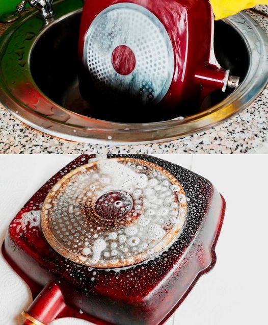 Das Auftragen des Produkts auf die Oberfläche der Pfanne führt nicht zum gewünschten Ergebnis. Der Entfetter muss unbedingt eine alkalische Substanz enthalten.