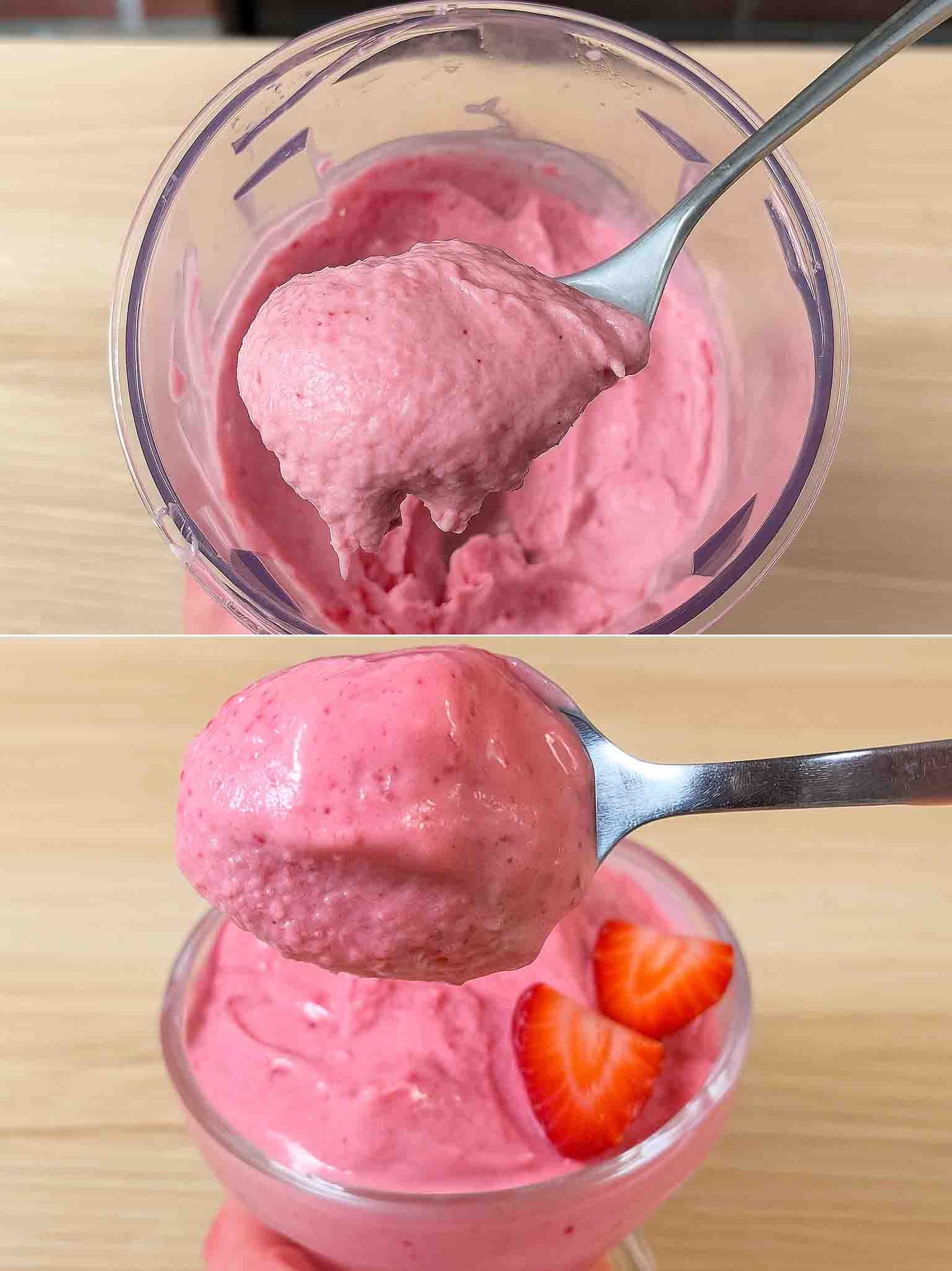 Bananen, eine Quelle für Kalium, Vitamin B6 und natürliche Kohlenhydrate, liefern langsame Energie und helfen dank ihres Tryptophangehalts, die Stimmung zu regulieren. Erdbeeren, kalorienarm und reich an Vitamin C, Anthocyanen und Ballaststoffen, unterstützen das Immunsystem und die kardiovaskuläre Gesundheit. Die Zugabe von Milch oder einem pflanzlichen Getränk gleicht das Rezept mit Proteinen aus und macht das Eis vollständiger und nahrhafter.