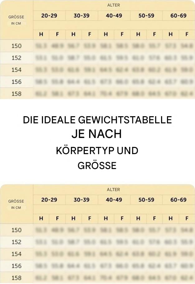 Eine Tabelle zeigt das ideale Gewicht in Abhängigkeit von Ihrer Größe und Ihrem Alter.(1/10)
