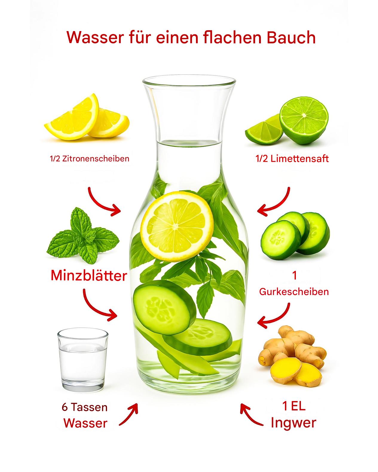Flachbauchwasser ist im Wesentlichen infundiertes Wasser, das durch mehrstündiges Einweichen von Obst, Kräutern, Gemüse und gewurzen in Wasser hergestellt wird. Die Idee ist, dass die natürlichen Zutaten ihre Aromen und Nährstoffe an das Wasser abgeben und so ein schmackhaftes und gesundes getrank bieten, das die Verdauung unterstützt, den Stoffwechsel ankurbelt und hilft, Blähungen zu reduzieren.