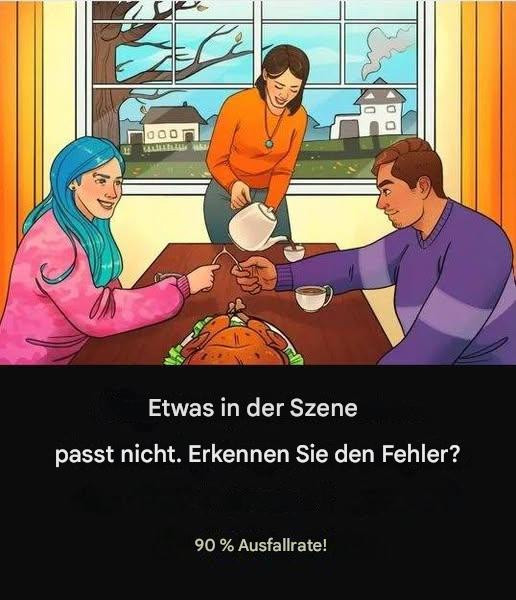 Dieses Mal präsentieren wir ein Bild, das auf den ersten Blick völlig normal erscheint. Drei Personen sitzen um einen Tisch und feiern scheinbar ein Thanksgiving-Essen. Zwei von ihnen brechen sich einen Truthahnknochen, um sich etwas zu wünschen, während der dritte sich einen Drink aus einer Teekanne einschenkt. Doch irgendetwas passt nicht ganz. Finden Sie den Fehler? Sie haben 10 Sekunden Zeit, ihn zu korrigieren.