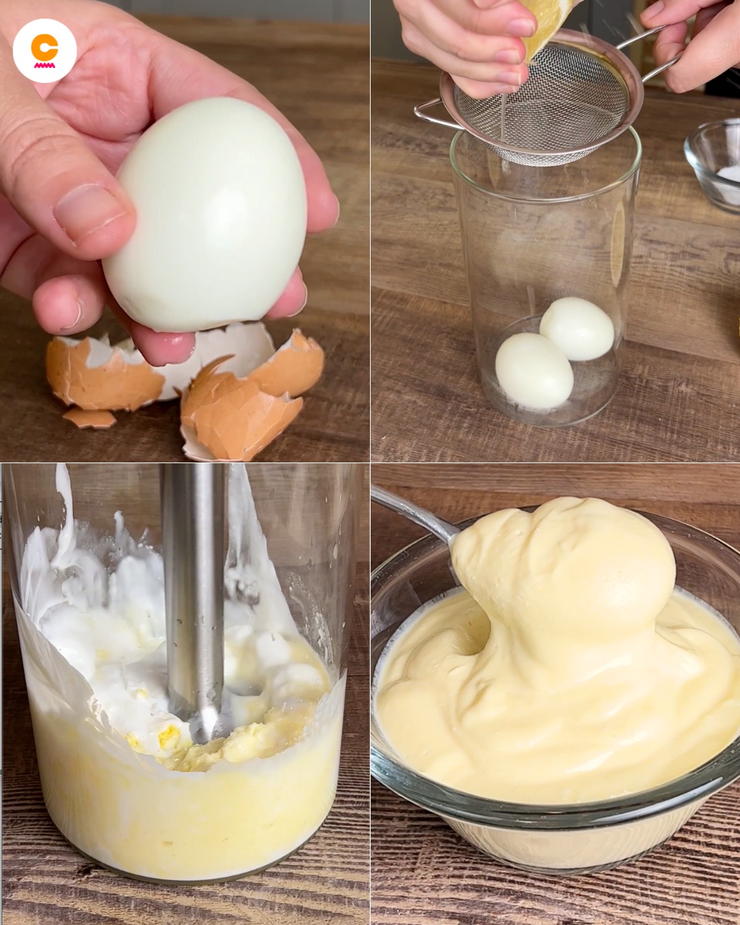 - Eier verrühren : Geben Sie die hartgekochten Eier in einen Mixer oder ein hohes Gefäß. Mischen, bis eine glatte Masse entsteht.