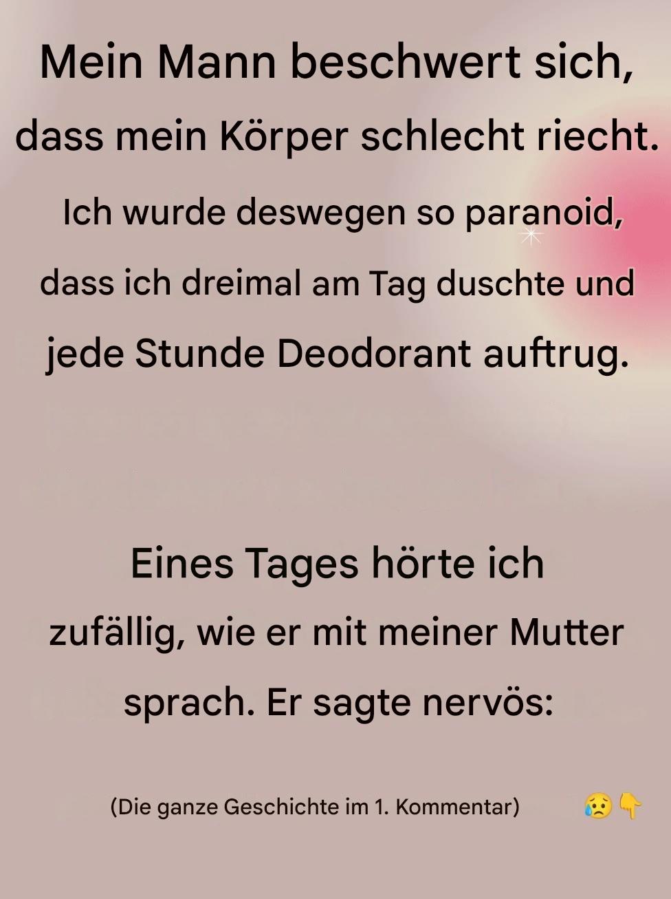 Eine 35-jährige Frau hat sich an unsere Redaktion gewandt und in einem Brief ihr Herz offenbart. Sie drückte aus, wie schwer es für sie gewesen sei, die traurige Realität zu akzeptieren: Ihr Mann hatte gerade einen zutiefst grausamen Aspekt ihrer Persönlichkeit enthüllt. Ihrer Meinung nach kritisierte er sie ständig wegen ihres Körpergeruchs, was sie in große emotionale Not stürzte. Ihre Wut erreichte jedoch einen neuen Höhepunkt, als sie mehr über die betrügerischen Taten ihres Mannes erfuhr, und sie empfand aufrichtiges Mitgefühl für ihren Schmerz.