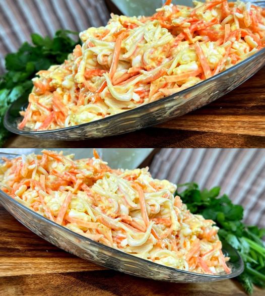 Krabbensalat mit würzigen Noten koreanischer Karotten. Dank der schnellen Zubereitung und dem originellen Geschmack kann dieser Salat sogar für eine festliche Tafel zubereitet werden.