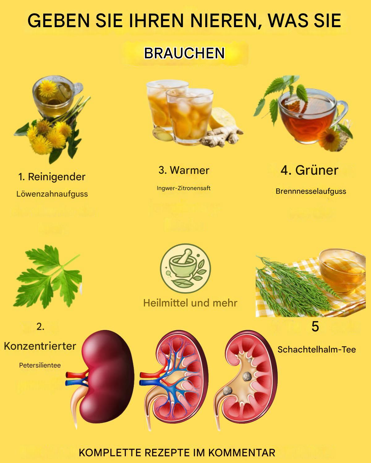 Zu den bekanntesten gehören Löwenzahn, Petersilie, Ingwer mit Zitrone, Brennnessel und Schachtelhalm. Diese Pflanzen haben harntreibende, entzündungshemmende und antioxidative Eigenschaften, die die Ausscheidung von Flüssigkeitsansammlungen fördern, der Bildung von Steinen vorbeugen und die ordnungsgemäße Funktion des Harnsystems unterstützen.