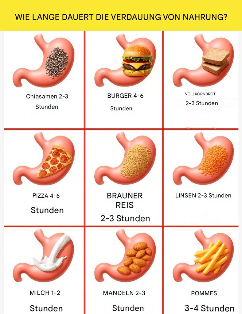 Die Verdauungszeit verschiedener Lebensmittel kann je nach Zusammensetzung und Form variieren. Hier ist eine Übersicht über die Verdauungsdauer einiger gängiger Lebensmittelgruppen: