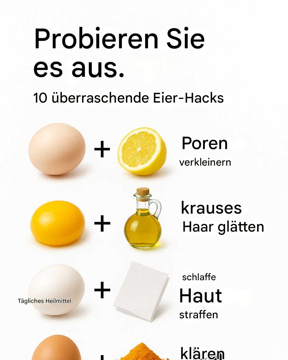 In diesem Artikel stellen wir zehn überraschende Eier-Hacks vor, die die Vielseitigkeit von Eiern demonstrieren. Ob Sie Ihre Schönheitspflege verbessern, die Hausarbeit erledigen oder einfach etwas Neues ausprobieren möchten – diese Tipps zeigen Ihnen, warum Eier einen besonderen Platz in Ihrem Zuhause verdienen. Probieren Sie es aus – diese Eier-Hacks könnten Ihre neuen Lieblingslösungen werden!