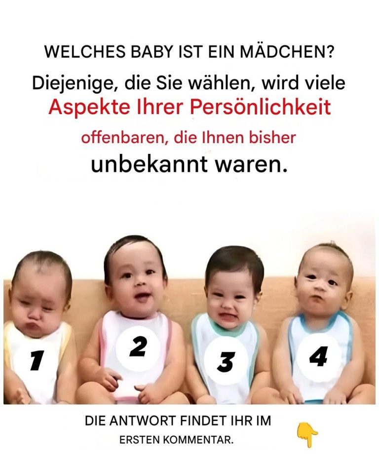 Du siehst ein entzückendes Foto: vier Babys nebeneinander, nummeriert von 1 bis 4, und eine einfache Frage: „Welches Baby ist ein Mädchen?“ Du wählst schnell, fast unbewusst, einfach „instinktiv“. Was wäre, wenn diese Wahl etwas mehr über deine Persönlichkeit verraten würde, als du denkst? Natürlich ist es kein wissenschaftlicher Test, aber es kann eine unterhaltsame Art sein, sich selbst besser kennenzulernen … und sich ein Lächeln zu zaubern.