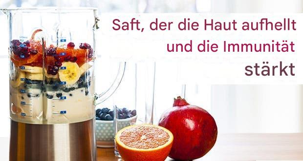 Granatapfelsaft enthält mehr Antioxidantien als grüner Tee. Er wirkt immunstärkend und hautaufhellend. Granatäpfel enthalten Tannine, die der Hautalterung vorbeugen (viele Hautpflegeprodukte verwenden Tannine wegen ihrer Anti-Aging-Wirkung). Granatäpfel sind wie Orangen und Blaubeeren für ihren hohen Gehalt an Antioxidantien und Vitamin C bekannt und stärken das Immunsystem.