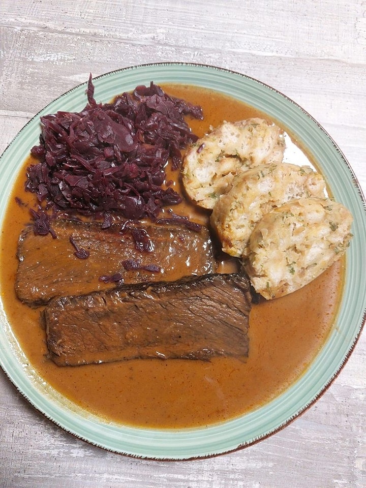 Sauerbraten mit Semmelknödeln und Apfelrotkraut