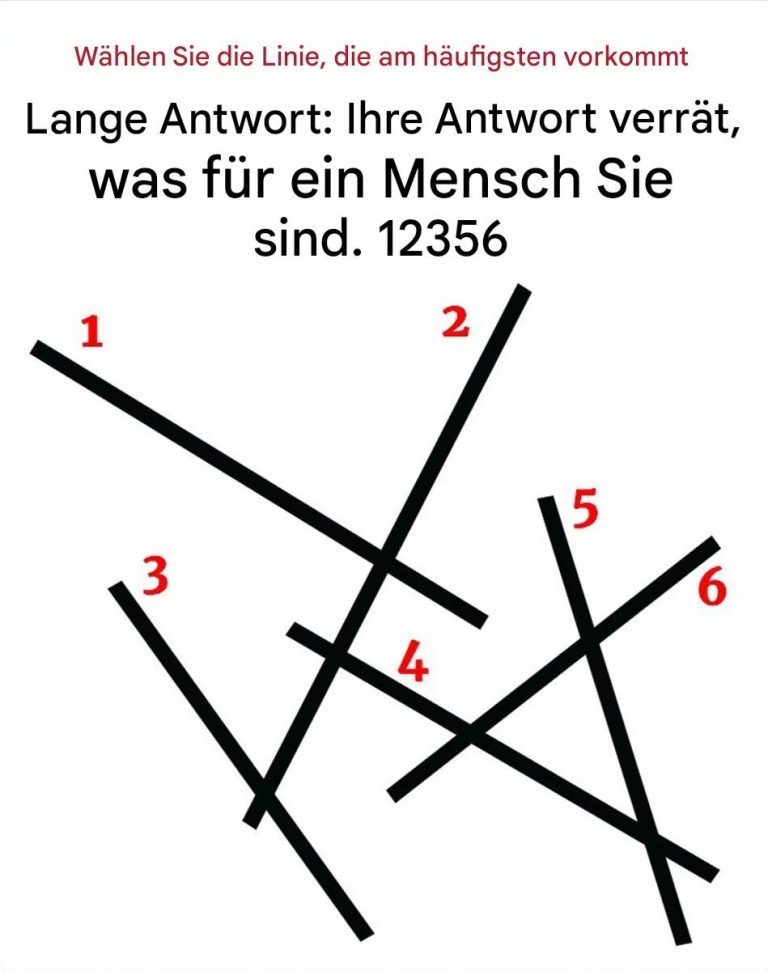 Auf den ersten Blick wirkt es wie ein harmloses kleines Spiel: Sechs schwarze Linien, nummeriert von 1 bis 6, nebeneinander. Ihre Aufgabe? Geben Sie an, welche Linie am längsten erscheint. Ganz einfach, oder? Und doch … hinter dieser scheinbar harmlosen Wahl verbirgt sich ein faszinierender Test Ihrer Wahrnehmung und Ihrer Lebenseinstellung. Sind Sie bereit, herauszufinden, was Ihre Intuition über Sie verrät?