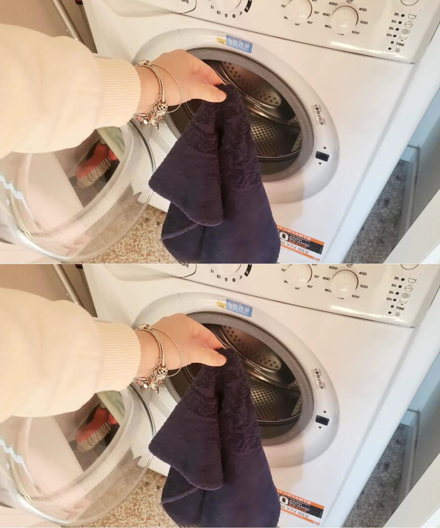 Sobald der Waschgang bendet ist, öffnen Sie die Tür der Waschmaschine und legen Sie ein sauberes Handtuch zwischen die noch feuchte Wäsche. Ein Handtuch reicht für eine halbe Ladung, zwei Handtücher werden für eine volle Ladung benötigt. Schließen Sie dann die Tür und starten Sie das Schleuderprogramm.