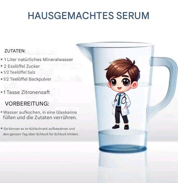 Selbstgemachte Kochsalzlösung ist eine wirksame Hydratationslösung, um Flüssigkeits- und Elektrolytverluste durch Durchfall, Erbrechen oder hitzebedingte Dehydration zu ersetzen. Sie ist eine einfache, kostengünstige und leicht zugängliche Lösung, die mit den in jedem Haushalt verfügbaren Grundzutaten zubereitet werden kann.