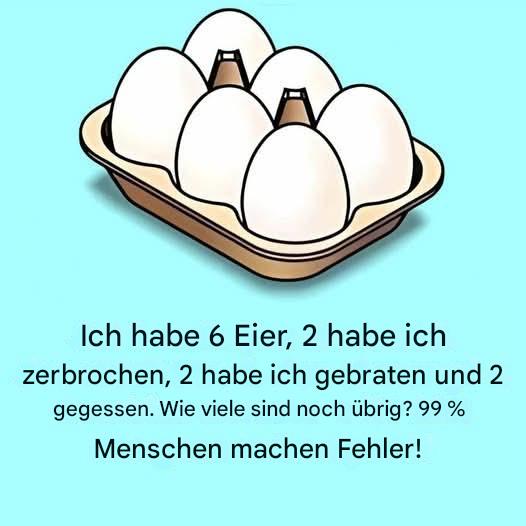Sie haben 6 Eier vor sich. Du zerbrichst zwei davon, kochst sie und isst sie dann. Wie viele Eier haben Sie wirklich noch übrig? Eine Frage, die einfach erscheint, aber die Antwort könnte Sie überraschen …