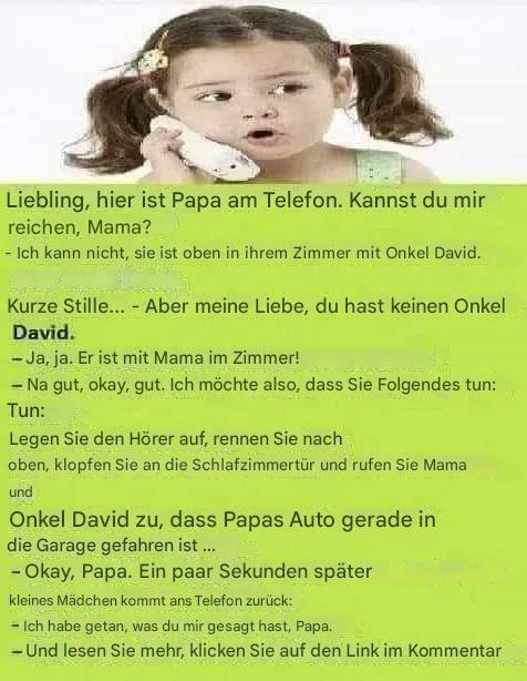Nach ein paar Sekunden nahm jemand ab. Es war ein kleines Mädchen. Der Vater fragte ihn dann: „Hallo Schatz, hier ist Papa am Telefon… Kannst du mir reichen, Mama?“